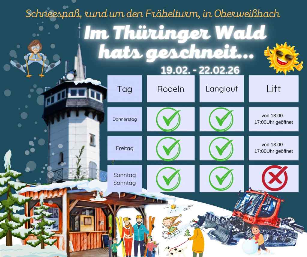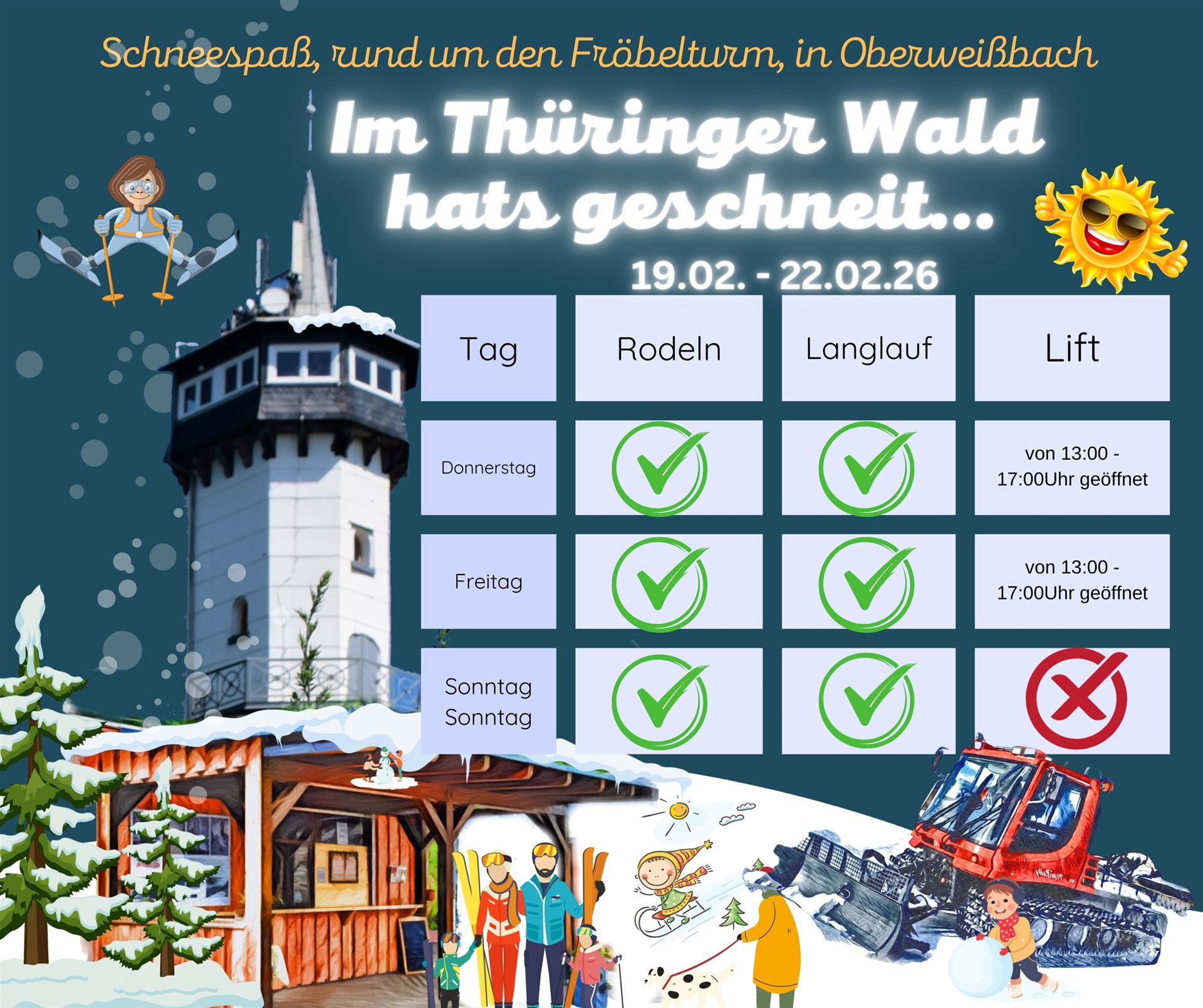 Hier oben auf dem Kirchberg, nahe der Fröbelstadt Oberweißbach, haben wir jede Menge Wintersportmöglichkeiten wie Rodeln, Langlauf, Abfahrt am Kirchberglift und Schneewandern auf kleinstem Raum. Es ist ein Paradies für alle Schnee- und Wintersportfreunde.