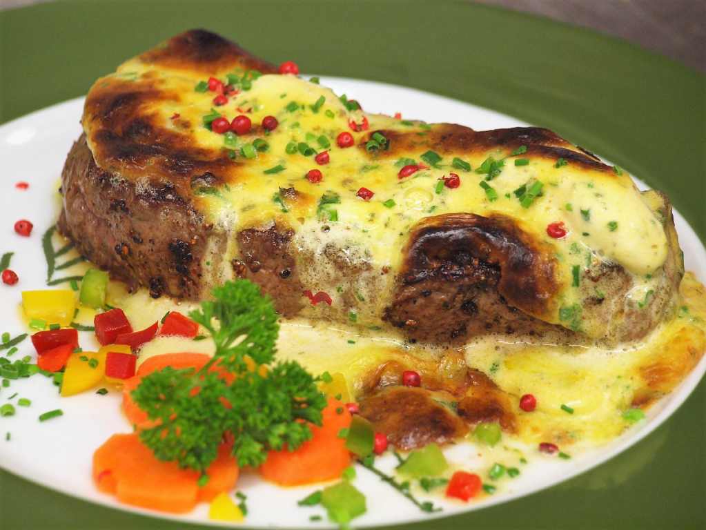 1 Schweinesteaks auf einer hausgemachten Rahmsoße und frischen Champignons,dazu empfehlen wir Spätzle | |