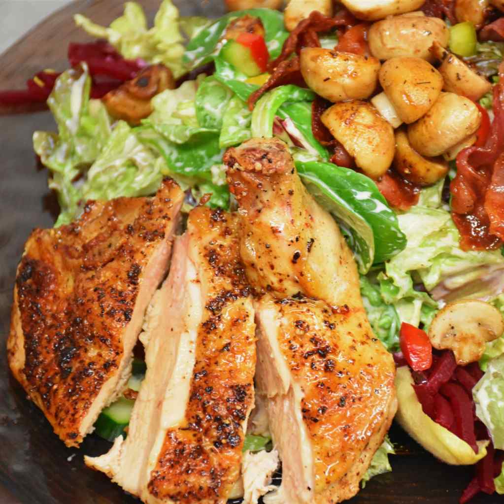 mit bunten Blattsalaten der Saison, Tomaten, Gurken, Sonnenblumen, und Pinienkernen, Paprika, knusprige Bacon, gebratenen Champignons, gehobeltem Parmesan frischen Kräutern und knuspriger Maishähnchenbrust | |