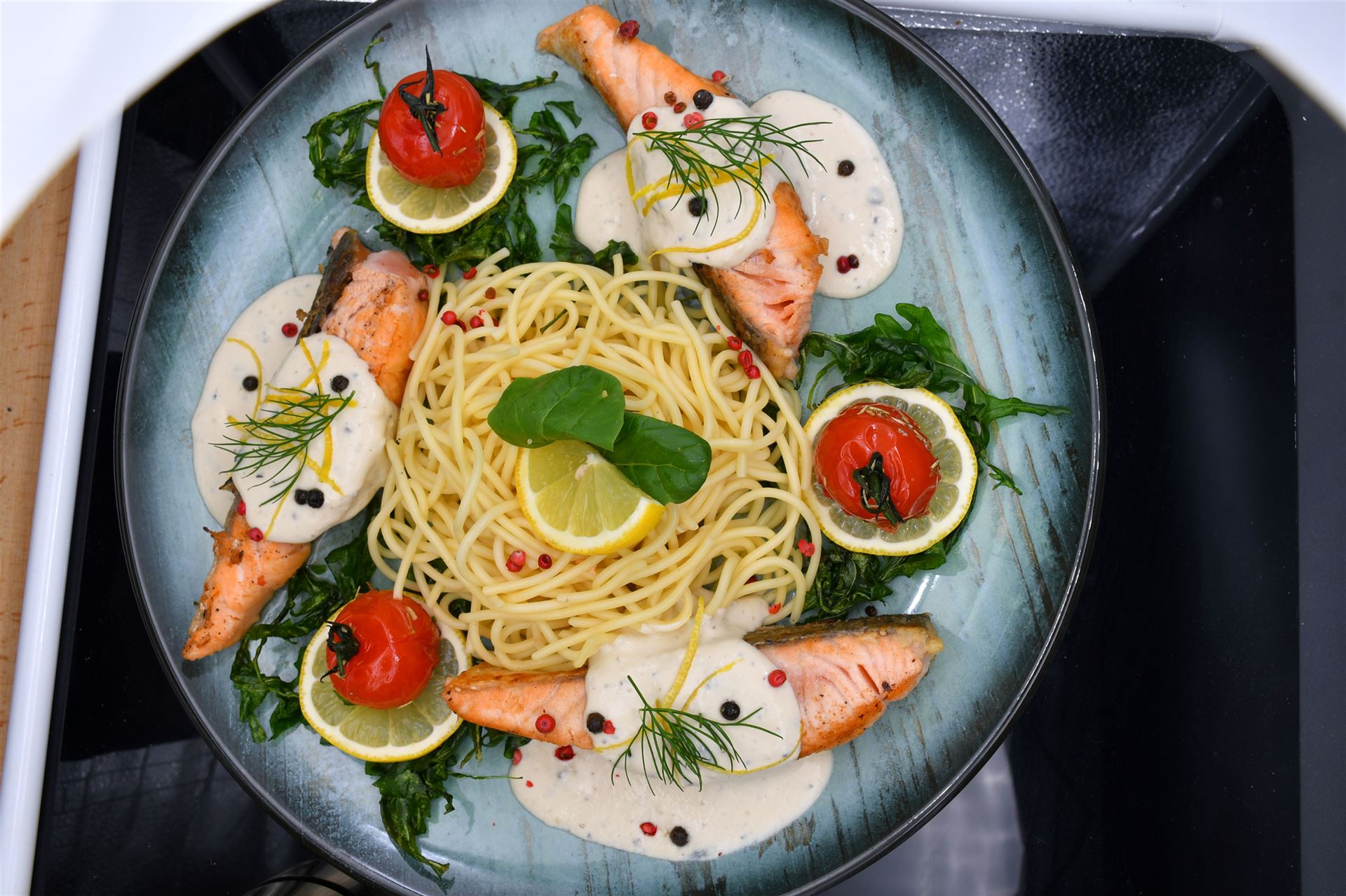 mit bunten Blattsalaten der Saison, Tomaten, Gurken, Sonnenblumen, und Pinienkernen, Paprika, knusprige Bacon, gebratenen Champignons, gehobeltem Parmesan frischen Kräutern und norwegischen Lachs auf der Haut gebraten | |