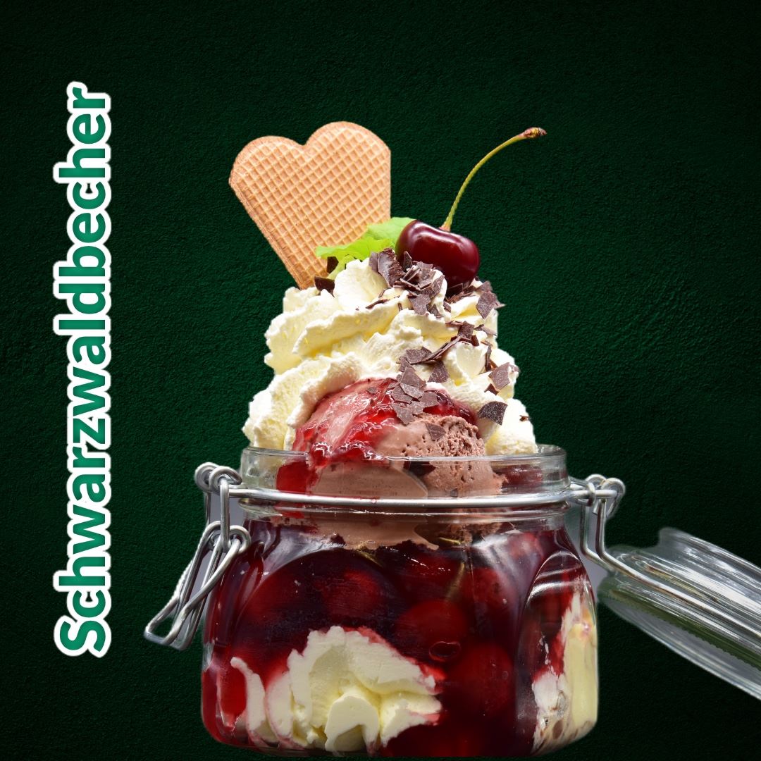 2 Kugeln Vanille und 1 Kugel Schokoeis mit Sauerkirschen, Kirschwasser und frischer Sahne
